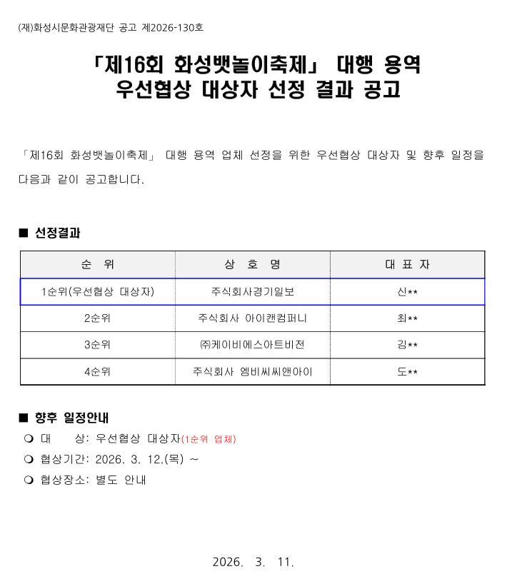화성시 대표 축제인 ‘화성 뱃놀이 축제’를 둘러싼 용역 선정 논란이 지역 사회로 확산되고 있다. 행사 대행 용역 우선협상 대상자가 선정되었지만, 심사 과정의 투명성에 대한 의문이 제기되면서 행정 신뢰 문제로까지 번지는 양상이다.