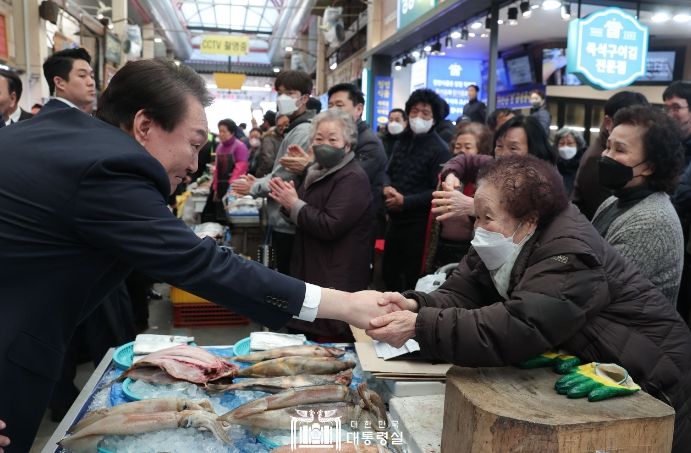 (시사미래신문) 윤석열 대통령은 2월 14일 오후, 충북의 대표 전통시장인 청주 육거리종합시장을 찾아 최근 물가·연료비 상승, 경기둔화 등으로 어려움을 겪고 있는 현장 상인들을 응원하고 격려하는 자리를 가졌다.