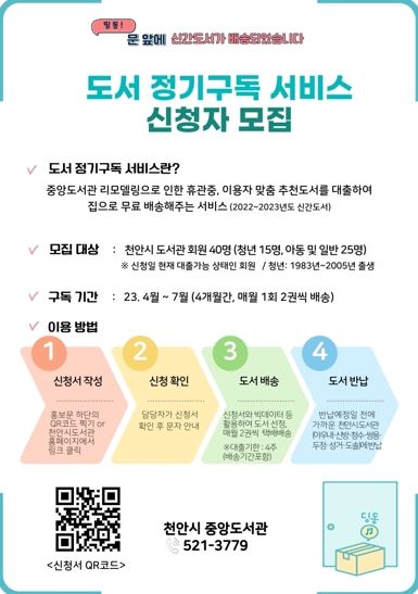 이 서비스는 천안시 도서관 회원을 대상으로 하며 아동, 청년, 일반으로 나눠 도서관 홈페이지를 통해 모집 후 4월부터 서비스할 예정이다.