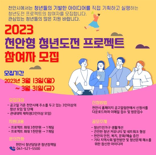 (시사미래신문) 천안시가 작년에 이어 청년들이 직접 아이디어를 제안·기획하고 실행하는 ‘청년도전 프로젝트’ 참여자를 13일부터 모집한다.