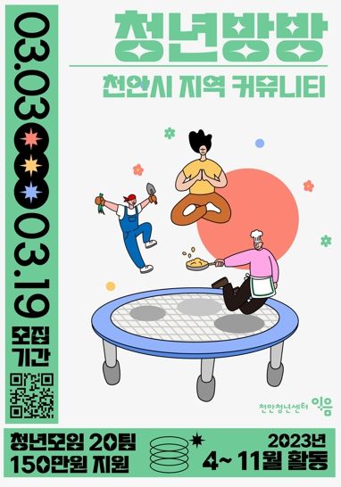 (시사미래신문) 천안시는 청년 소통공간인 천안청년센터 이음을 통해 청년들의 자발적인 모임 활동을 지원하는 ‘청년방방’ 사업에 참여할 20팀을 모집한다고 밝혔다.