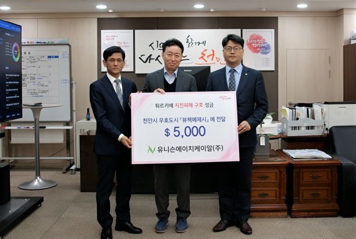 (시사미래신문) 천안시 소재 유니슨에이치케이알(주)은 지난 13일 오후 천안시청을 방문해 튀르키예 지진피해 이재민 지원을 위해 써달라며 성금 5,000불을 천안시에 전달했다.