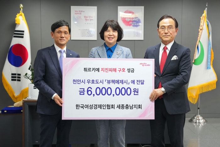 주희정 회장은 “최근 천안시는 물론 지역 내 기업인들이 튀르키예 지진피해 기부에 앞장서는 모습에 깊은 인상을 받아 우리 협회에서도 힘을 모았다”며 “이번 지진으로 인한 피해가 하루빨리 복구되길 바라는 소망을 담아 작은 정성을 보탠다”고 밝혔다.