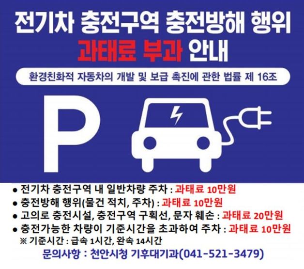 (시사미래신문) 천안시가 전기자동차 충전구역 내 위반행위에 대한 과태료 부과 건수가 증가하면서 주의를 당부했다.