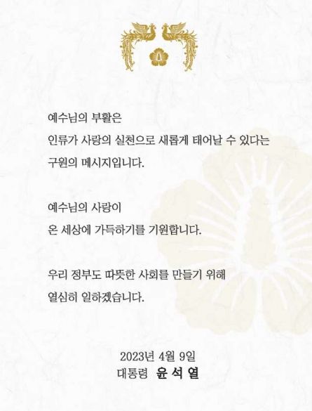 오늘 부활절 연합예배에 참석하기 전, 윤 대통령은 SNS를 통해 예수님 부활을 축하하는 축전을 게시하기도 했다.