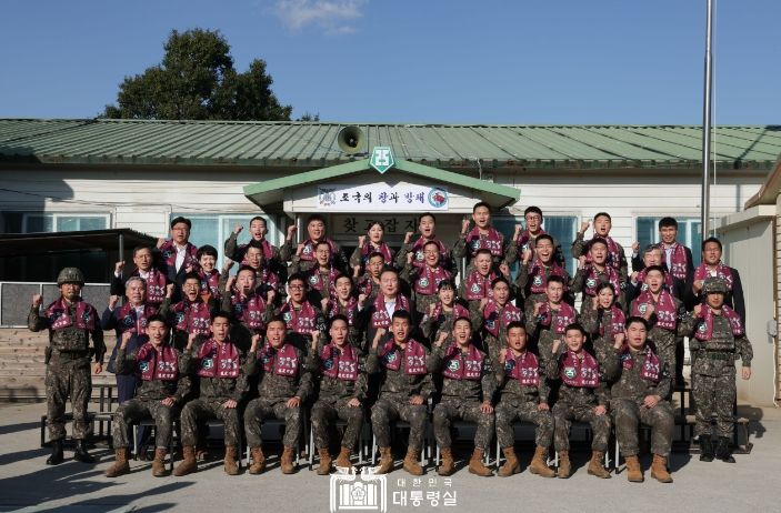 대통령은 이어서 ‘영원히 잊지 못할 전우로 뭉쳤으니 우리는 하나다!’라고 적힌 머플러를 착용하고 “25사단 파이팅”, “상승비룡 파이팅”을 외치며 부대원들과 함께 기념사진을 촬영했다. 대통령은 마지막으로 “건강 챙기시길 바란다”며 부대원들을 격려하고 부대를 떠났다.