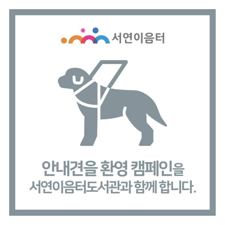 장애인 안내견 캠페인 또는 스티커 배부에 관한 자세한 내용은 서연이음터도서관 홈페이지(https://www.hscitylib.or.kr/sylib/index.do) 를 통해 확인 가능하다.