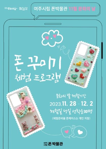 (시사미래신문) 여주시립 폰박물관은 11월 경기도 문화의 날을 맞아 휴대전화 케이스 꾸미기, 일명 ‘폰꾸미기’ 체험 프로그램을 운영한다.
