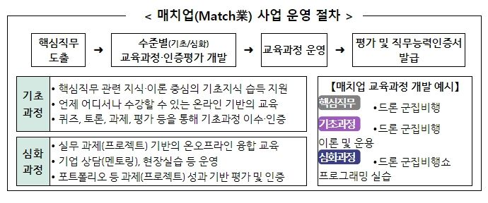 올해는 매치업 사업을 통해 생명건강(바이오헬스), 항공·무인기(드론), 미래자동차 등 신산업 13개 분야에서 80개 이상의 교육과정을 운영한다. 온라인으로 제공되는 기초과정과 온오프라인 융합형으로 제공되는 심화과정을 통해 산업 분야별 핵심 직무역량을 체계적으로 기를 수 있다. 또한, 교육과정을 이수한 후에는 대표기업에서 발급하는 ‘직무능력인증서’를 발급받을 수 있다.