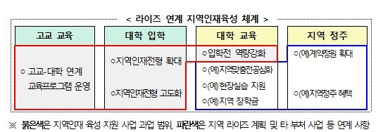 각 지역은 지역 라이즈 계획과 본 사업을 연계하여 대학 입학 전후 단계의 인재육성 지원을 강화하는 한편, 타 부처 사업과 연계를 통해 대학 졸업 후 지역 내 취업 및 정주를 유도할 수 있도록 하여 보다 완결성 있는 지역인재육성 지원 모델을 제안할 수 있다.