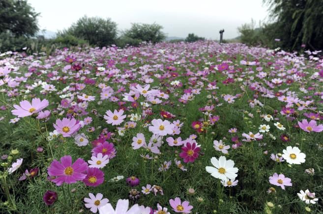 이곳 코스모스 길은 분홍, 아이보리, 자주 등 다양한 색깔의 꽃물결을 이뤄 파란 가을하늘 속 아름다운 풍경을 연출하고 있다.