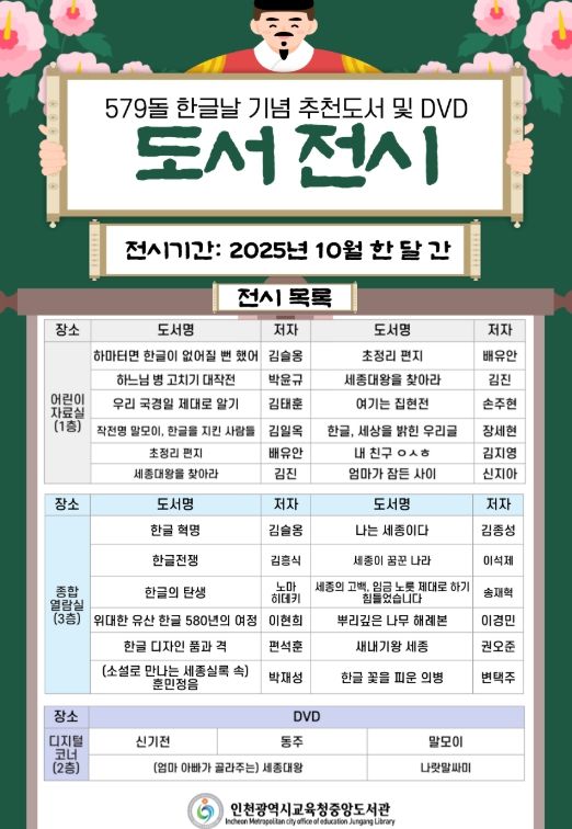 (시사미래신문) 인천광역시교육청중앙도서관은 한글 창제 579돌을 기념해 10월 한 달 동안 ‘한글날 추천 도서 및 DVD’ 전시를 운영한다.