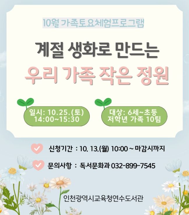 (시사미래신문) 인천광역시교육청연수도서관은 오는 10월 25일 오후 2시 평생학습1실에서 가족 이용자를 위한 ‘10월 가족 토요체험 프로그램’을 운영한다.