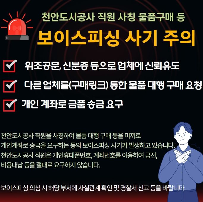 공사는 최근 천안도시공사 직원을 사칭해 구매링크를 통한 물품 대행 구매를 요청하거나 개인 계좌로 금품 송금을 요구하는 등의 사례가 발생했다고 14일 밝혔다.