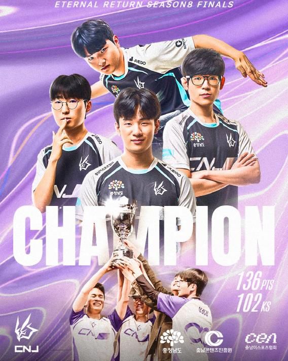 (시사미래신문) (재)충남콘텐츠진흥원은 충청남도를 대표하는 이스포츠 게임단 ‘CNJ Esports가 2025년 10월 12일 대전 드림 아레나에서 열린 이터널 리턴 마스터즈 시즌8 파이널에서 우승을 차지했다고 밝혔다.