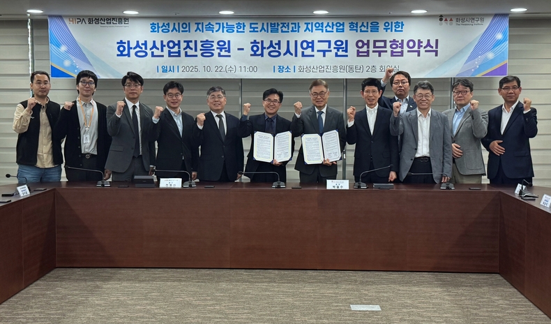 (시사미래신문) 화성시연구원(원장 박철수)과 화성산업진흥원(원장 전병선)은 10월 22일(수), 화성시의 지속가능한 도시 발전과 지역 산업 경쟁력 강화를 위한 정책 연구 및 산업 생태계 조성을 목표로 업무협약(MOU)을 체결했다.