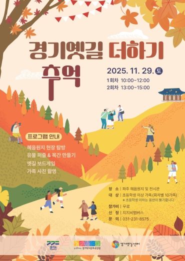 (시사미래신문) 경기문화재단 경기역사문화유산원는 오는 11월 29일 토요일, 의주길에 위치한 파주 혜음원지 일대에서 초등학생 이상 자녀를 둔 가족을 대상으로 하는 역사 체험 프로그램 ‘경기옛길 더하기 추억’을 개최한다고 밝혔다.