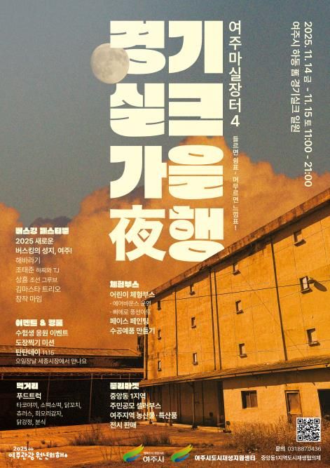 (시사미래신문) 여주시는 오는 11월 14일부터 15일까지 이틀간 여주 경기실크 일원(여주시 하동 123-6번지)에서 '여주마실장터4 가을야행'을 개최한다고 밝혔다. 이번 행사는 '2025 새로운 버스킹의 성지, 여주!'라는 슬로건 아래, 깊어가는 가을밤의 정취를 더할 버스킹 페스티벌과 함께 다채로운 마켓과 체험을 선보일 예정이다.