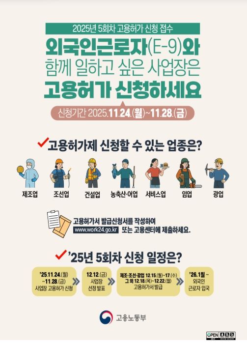 (시사미래신문) 고용노동부는 11월 24일부터 11월 28일까지 전국 지방고용노동관서를 통해 외국인근로자(E-9)에 대한 올해 5회차 신규 고용허가 신청을 받는다.