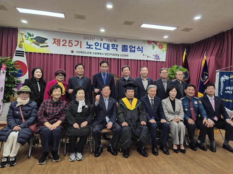 (사)대한노인회 수원특례시 장안구지회 부설 노인대학은 지난 4월 3일 입학한 61명의 어르신들이 8개월간 총 25주 과정의 교육 프로그램을 성실히 이수하고 이날 졸업의 결실을 맺었다.