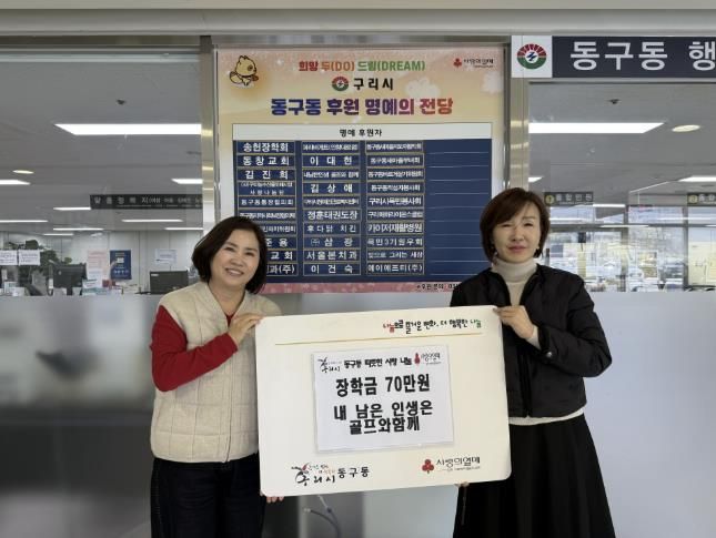 (시사미래신문) 구리시 동구동 행정복지센터는 지난 18일 동구동 행정복지센터 대회의실에서 '내 남은 인생은 골프와 함께' 모임으로부터 관내 취약계층 청소년을 위한 장학금 70만 원을 기탁받았다고 밝혔다.