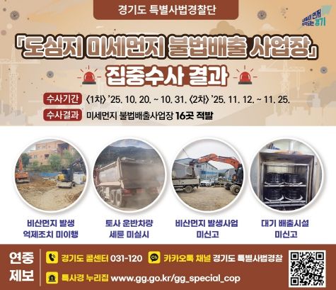 (시사미래신문) 경기도는 도심지 미세먼지 발생사업장 330개를 대상으로 불법 배출 행위를 집중 수사해 대기환경보전법 위반 사업장 16개를 적발했다고 9일 밝혔다.