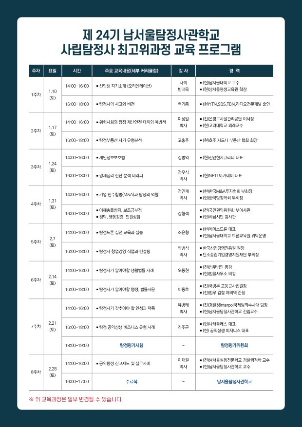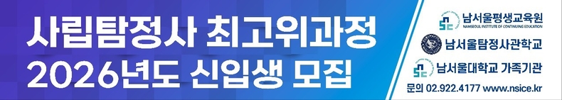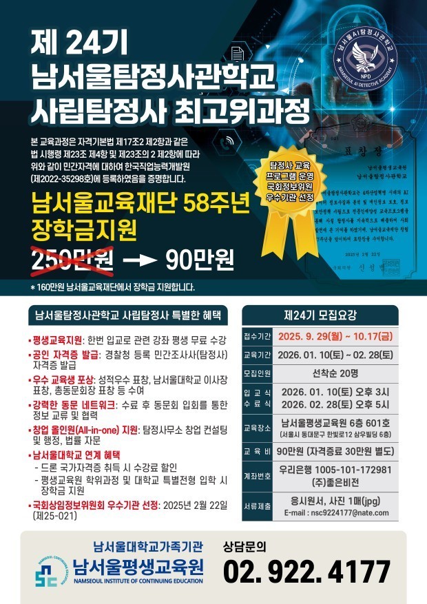 남서울대학교 가족기관 남서울평생교육원 부설 남서울탐정사관학교는 오는 2026년 1월 10일(토) 오후 2시, 서울 동대문구에 위치한 남서울평생교육원 6층 601호에서 '제24기 사립탐정사 최고위과정'의 입교 및 개강식을 개최한다고 밝혔다.