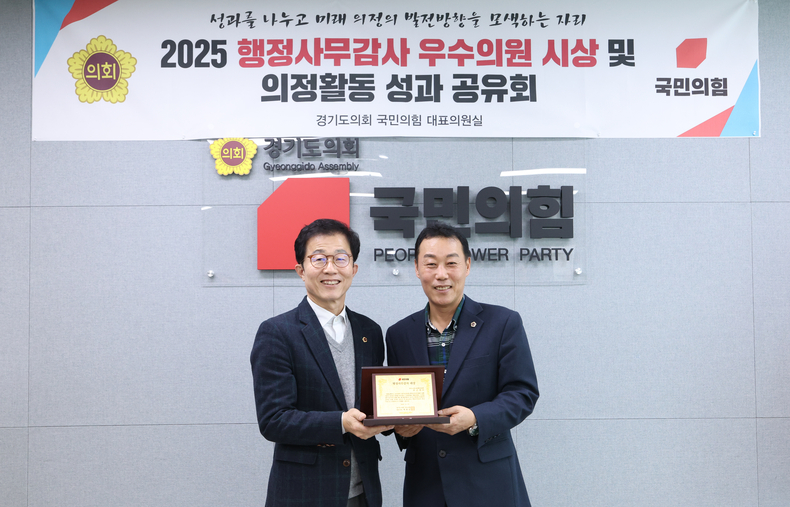 한편 ‘경기도의회 국민의힘 2025년 종합행정사무감사 대상의원’ 시상식은 행정사무감사에서 도민 중심의 정책 대안을 제시하고 실효성 있는 민생정치를 구현한 의원을 선정해 우수사례를 공유함으로써, 의정활동의 전문성과 책임성을 강화하기 위해 마련됐다.