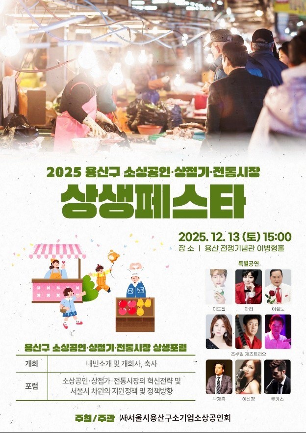 용산구 지역 경제의 주역들이 한자리에 모인 ‘2025 용산구 소상공인·상점가·전통시장 상생페스타’가 지난 12월 13일(토) 용산 전쟁기념관 이병형홀에서 소상공인들의 적극적인 참여와 뜨거운 호응 속에 성공적으로 막을 내렸다. (사)사울시용산구소기업소상공인회 주최/주관으로 열린 이번 페스타는 약 500여 명의 소상공인 및 관계자들이 참석하여 지역 경제 주체들의 상생과 혁신에 대한 강한 의지를 보여주었다.