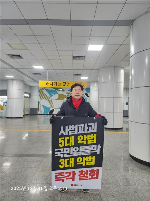 수원시 무지역 국민의힘 박 재순 위원장은 최근 수원시 영통구 권선구 일대에서 ‘사법파괴 5대 악법’과 ‘국민입틀막 3대 악법’의 즉각 철회를 촉구하는 1인 시위를 진행하며, 국가보안법 폐지 시도가 대한민국의 근간을 흔드는 위험한 선택이라고 주장했다.