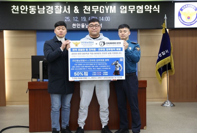 (시사미래신문) 천안 동남경찰서(서장 송해영)는 2025년 12월 19일(금) 오후 2시, 천안동남경찰서 중회의실에서 무에타이·MMA 전문 체육관인 ‘천무짐’(관장 문보람)과 ‘경찰관 체력 증진 및 복지 향상’을 위한 업무협약(MOU)을 체결했다고 밝혔다.