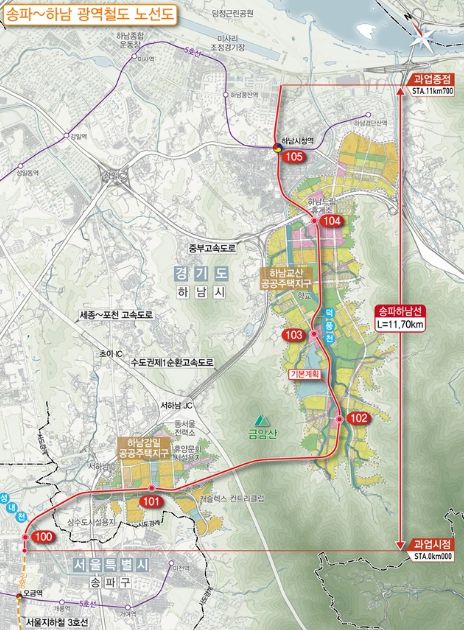 송파하남선 광역철도 건설사업은 서울지하철 3호선 오금역에서 하남시청역까지 총 연장 11.7km 구간을 연결하는 광역철도 건설사업이다. 기존 서울 도심과 하남 감일·교산 신도시를 경유하며 2027년 착공, 2032년 개통을 목표로 추진하고 있다.