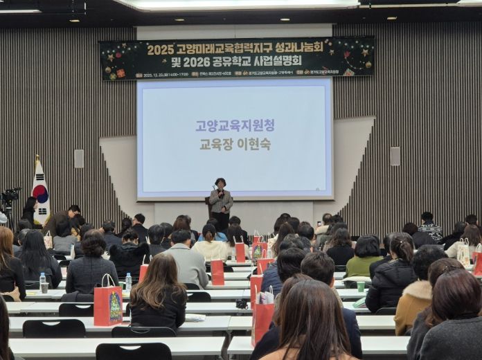 (시사미래신문) 경기도고양교육지원청은 2025년 12월 23일 킨텍스 제2전시장(401~403호)에서‘2025 고양미래교육협력지구 성과나눔회 및 2026 공유학교 사업설명회’를 개최했다. 이날 행사에는 고양 관내 유·초·중·고 교사, 학교관리자, 학생, 협력 마을활동가 등 총 400여 명이 참석해 고양교육의 미래를 함께 모색했다.