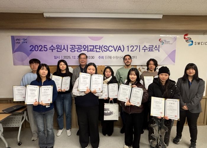 (시사미래신문) 수원시국제교류센터가 22일 센터에서 ‘수원시 공공외교단(SCVA) 12기’ 수료식을 열고, 단원 16명에게 수료증을 전달했다. 우수활동자 4명에게는 상장을 수여했다.