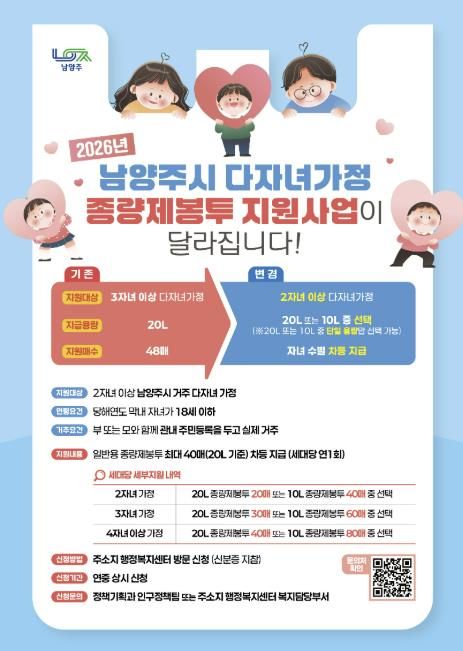 해당 가정은 신분증을 지참해 거주지 읍·면·동 행정복지센터를 방문하면 수령 가능하며, 관련 사항은 남양주시 정책기획과 인구정책팀 또는 주소지 행정복지센터를 통해 안내받을 수 있다.