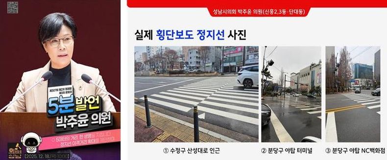 (시사미래신문) 성남시의회 박주윤 의원(국민의힘, 신흥2·3동·단대동)은 12월 18일 열린 제307회 성남시의회 제3차 본회의 5분 발언에서 보행자의 생명과 직결된 ‘횡단보도 정지선 이격거리 확대 설치’의 시급성을 강조하며, 성남시의 적극적인 개선책 마련을 촉구했다.
