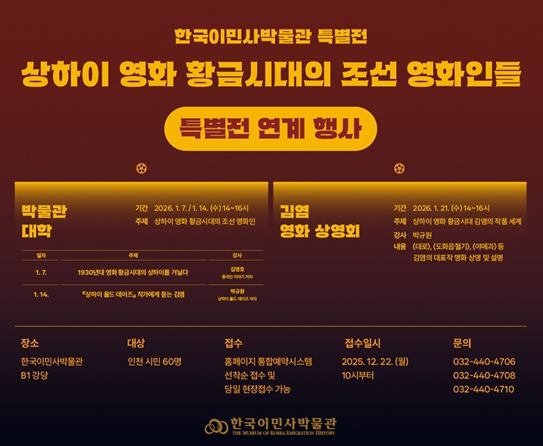 (시사미래신문) 인천광역시 시립박물관 분관 한국이민사박물관은 특별전 〈상하이 영화 황금시대의 조선 영화인들〉과 연계해 유명 작가 초청 특강을 개최한다고 밝혔다.