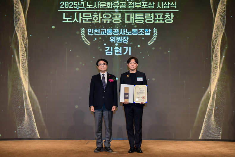 (시사미래신문) 인천교통공사노동조합 김현기 위원장이 30일 서울 피스앤파크 컨벤션에서 열린 ‘2025년 노사문화 유공 등 정부포상 시상식’에서 노사문화 유공 부문 대통령 표창을 수상했다.