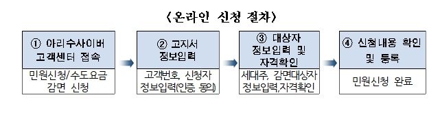 신청방법은 방문신청 또는 온라인신청이 가능하다. 방문 신청은 1월 12일부터 감면받을 주소지 관할 동주민센터에서 우선 접수하며, 온라인 신청은 3월 3일부터 서울아리수본부 누리집 내 아리수 사이버고객센터에서 할 수 있다.