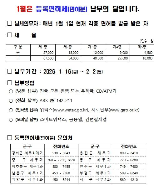 (시사미래신문) 인천광역시는 2026년 정기분 등록면허세(면허분) 396,262건, 총128억 원을 부과·고지했다고 밝혔다.