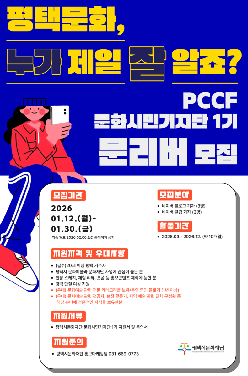 모집 분야는 글·사진과 영상 등 2개 분야로 모집인원은 총 6명이며, 문화예술에 대한 기본적인 이해를 바탕으로 활동이 가능한 평택 시민이라면 누구나 지원할 수 있다. 지원자는 평택시문화재단 홈페이지 공지사항에서 지원서를 내려받아 작성한 후 담당자 이메일로 접수하면 된다. 최종 합격자는 2026년 2월 6일, 재단 홈페이지를 통해 발표할 예정이다.
