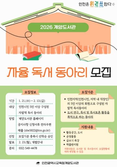(시사미래신문) 인천광역시교육청계양도서관은 지역 내 독서 문화를 확산하고 시민의 자발적인 독서 활동을 지원하기 위해 ‘2026년 자율 독서동아리’를 모집한다.