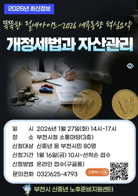 (시사미래신문) 부천시는 1월 27일 시청 3층 소통마당에서 ‘2026년 개정세법과 자산관리’ 재무특강을 진행한다. 이번 특강은 오후 2시부터 5시까지 부천시민 80명을 대상으로 무료로 진행되며, 신중년의 자산관리 역량을 높이고 안정적인 노후설계를 지원하기 위해 마련됐다.