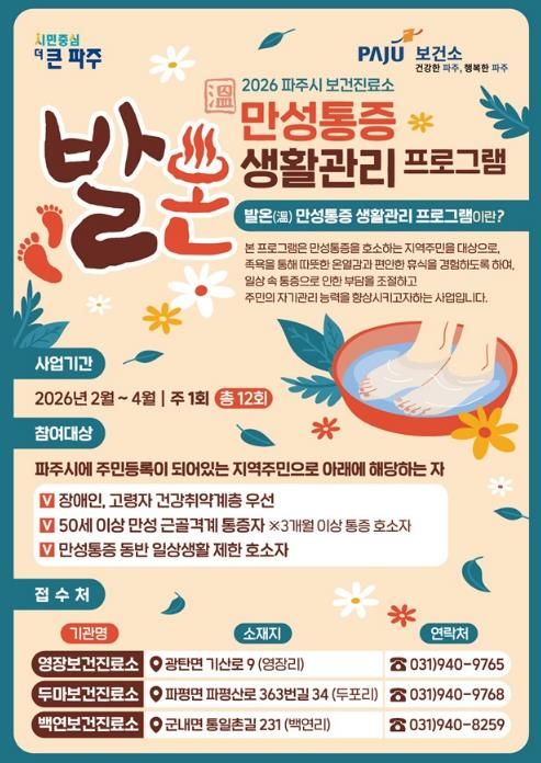 (시사미래신문) 파주시 보건진료소는 보건의료 취약지역 주민들의 건강증진을 위해 2026년 ‘발온(溫) 만성통증 생활관리’교실을 운영한다.