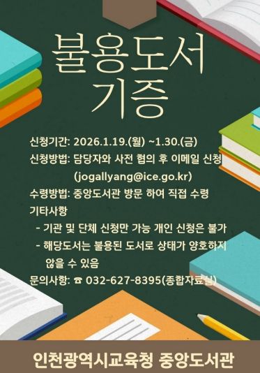 (시사미래신문) 인천광역시교육청중앙도서관은 지역사회 내 도서 나눔 문화를 확산하고 지식 자원의 선순환을 실천하기 위해 ‘불용도서 기관 나눔’ 사업을 운영한다.