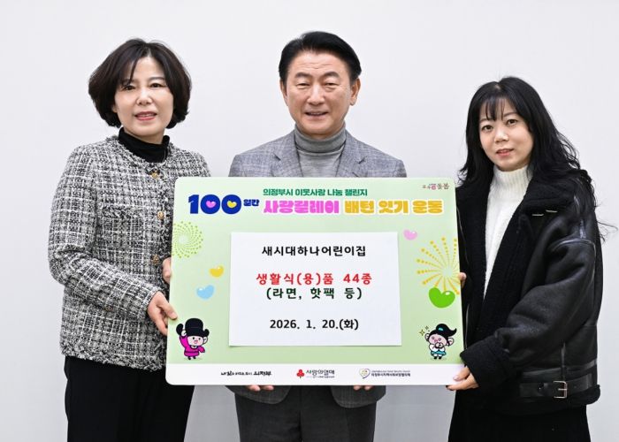 (시사미래신문) 의정부시는 1월 20일 새시대하나어린이집이 ‘100일간 사랑릴레이 배턴 잇기’에 동참해 관내 저소득층을 위한 생활식(용)품 44종(라면, 핫팩 등)을 기부했다고 밝혔다.
