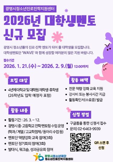 (시사미래신문) 광명시청소년재단 청소년진로진학지원센터는 관내 중·고등학교 청소년 대상 학과 멘토링 운영을 위해 ‘2026년 대학생 멘토단(wave)’을 모집한다고 밝혔다.