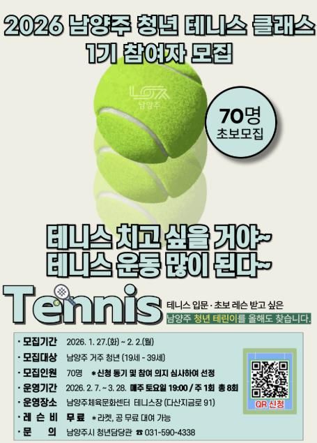 (시사미래신문) 남양주시는 27일부터 내달 2일까지 ‘2026 남양주 청년 테니스 클래스 1기’ 참여자를 모집한다고 밝혔다.