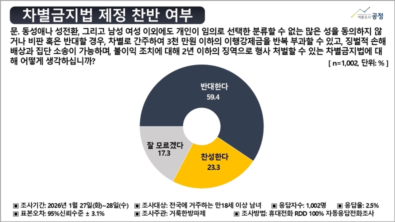 27일 여론조사 전문기관 ‘여론조사 공정’이 발표한 조사 결과에 따르면, 차별금지법 제정에 대해 ‘반대한다’는 응답이 59.4%로 과반을 훨씬 넘겼다.