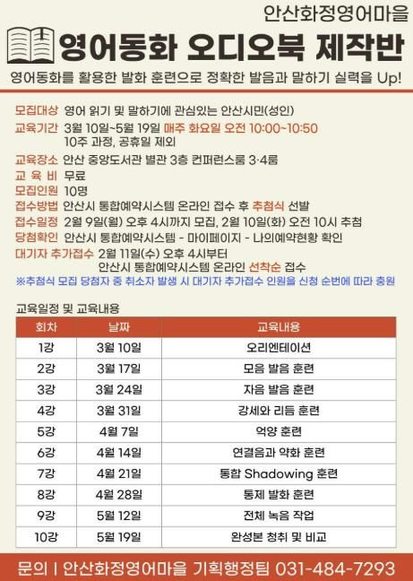 (시사미래신문) 안산시가 설립하고 안산대학교가 운영하는 안산화정영어마을이 성인 영어 학습자를 위한 ‘영어동화 오디오북 제작반’을 3월부터 5월까지 10주 과정으로 안산시 중앙도서관에서 운영한다고 4일 밝혔다.